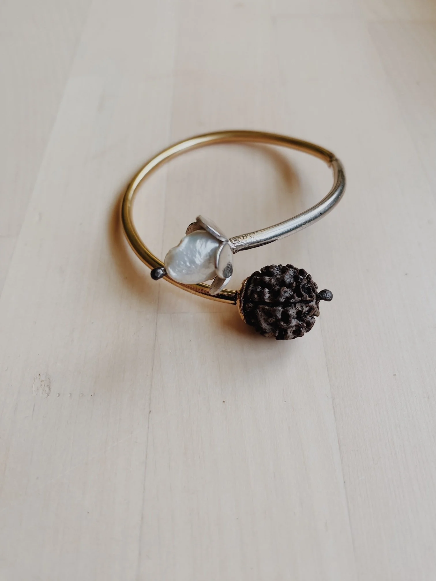 Made in brass and recycle sterling silver set with a quandong and a freshwater pearl. This is a very sentimental pieces to see her through into adulthood.